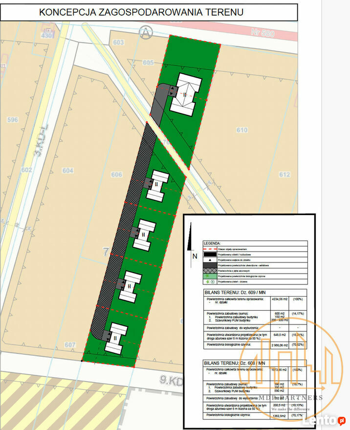 Działka objęta MPZP, który przewiduje zabudowę dwulokalową. Analiza chłonności wykazuje 10 jednostek mieszkalnych. PUM między 1370m2 a 1440m2!